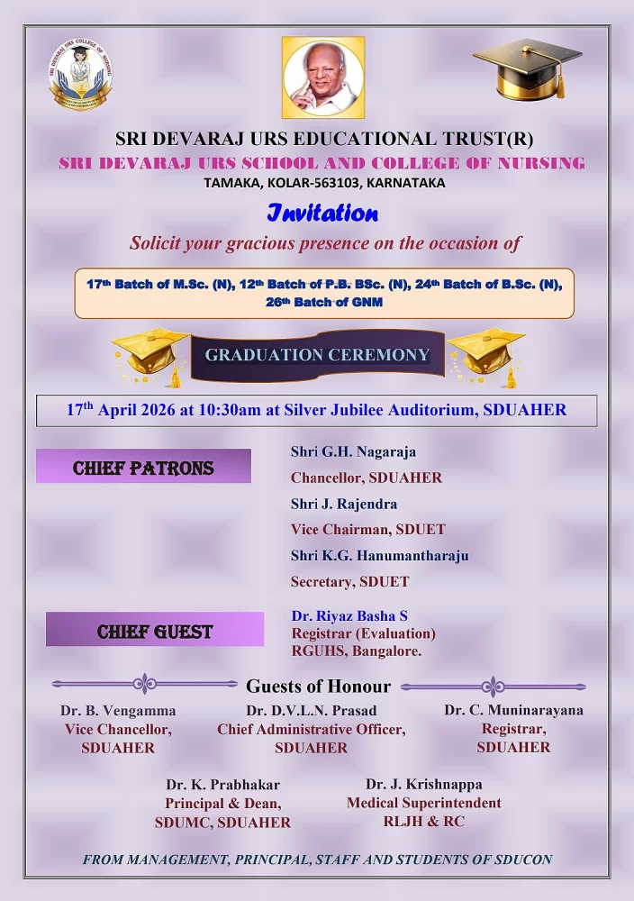 Dr. G Vijayalakshmimi, is appointed as Principal at Sri Devaraj Urs College of Nursing, Tamaka, Kolar in 1st April 2012. Completed Basic B.Sc(N) in 1992 from Government College of Nursing, Bangalore, Karnataka, M.Sc(N) with Medical Surgical Nursing speciality in 1997 from Dr.M.V.Shetty Institute of Health Sciences, Mangalore from Mangalore University and PhD(N) from Annapoorna College of Nursing, Vinayaka Mission University, Salem, Tamilnadu in 2010.
